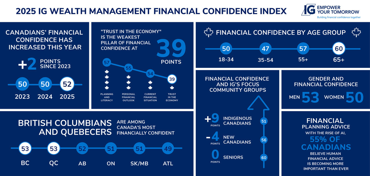 The IG Financial Confidence Index tracks and reports on Canadians' overall financial confidence by examining IG’s Four Pillars of Financial Confidence: Current Personal Financial Situation, Personal Financial Outlook, Planning and Literacy and Trust in the Economy.