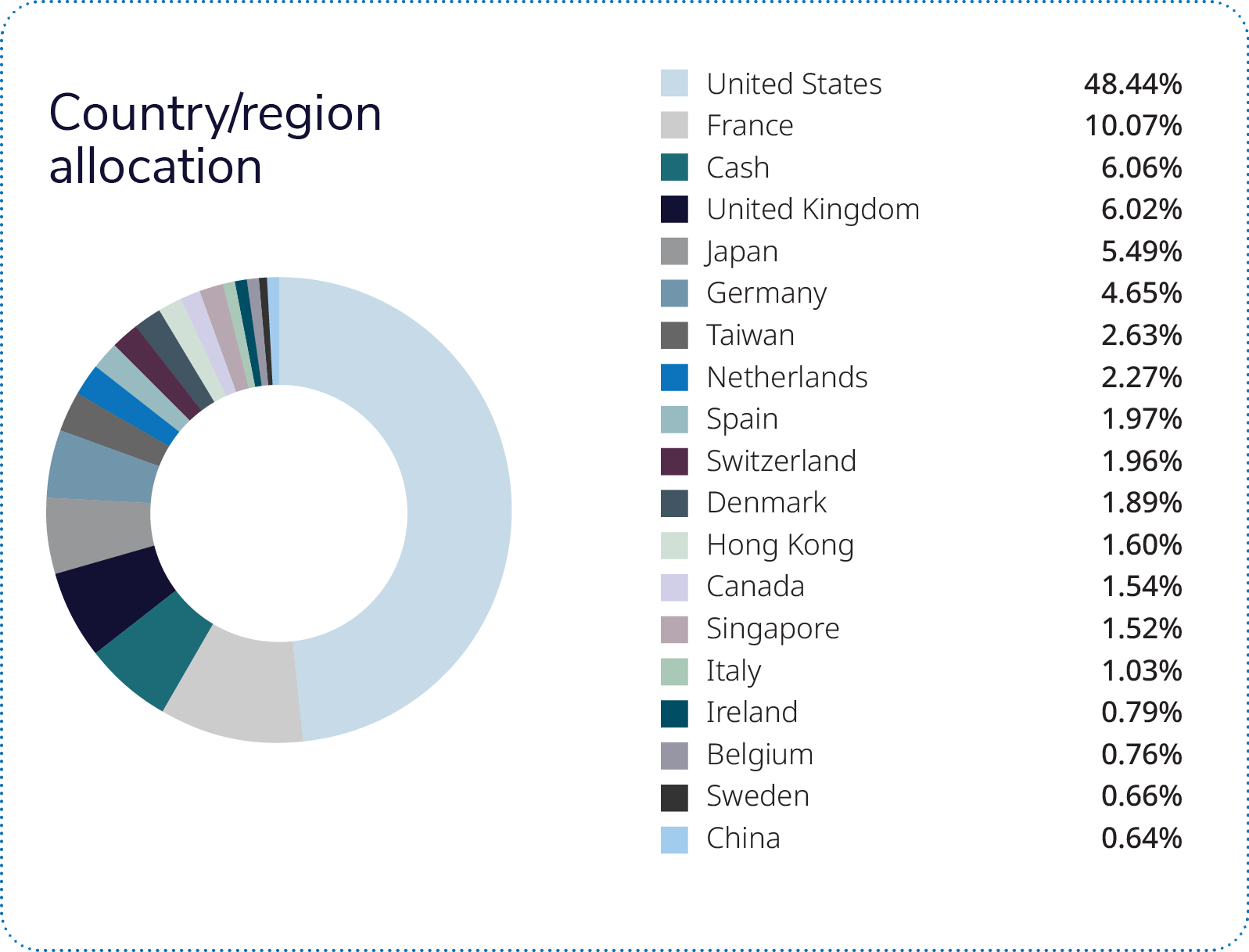 Technology represents the largest absolute portion of the portfolio but still has less allocation to the sector compared with the benchmark. Semiconductors and semiconductor‑equipment companies form the core of this exposure, with major holdings including Broadcom, TSMC, ASML, Microsoft, Apple and Fujitsu. Throughout the year and into the fourth quarter, managers continued to focus on leading global chip manufacturers and select software names aligned with long‑term AI and digital‑transformation trends.
