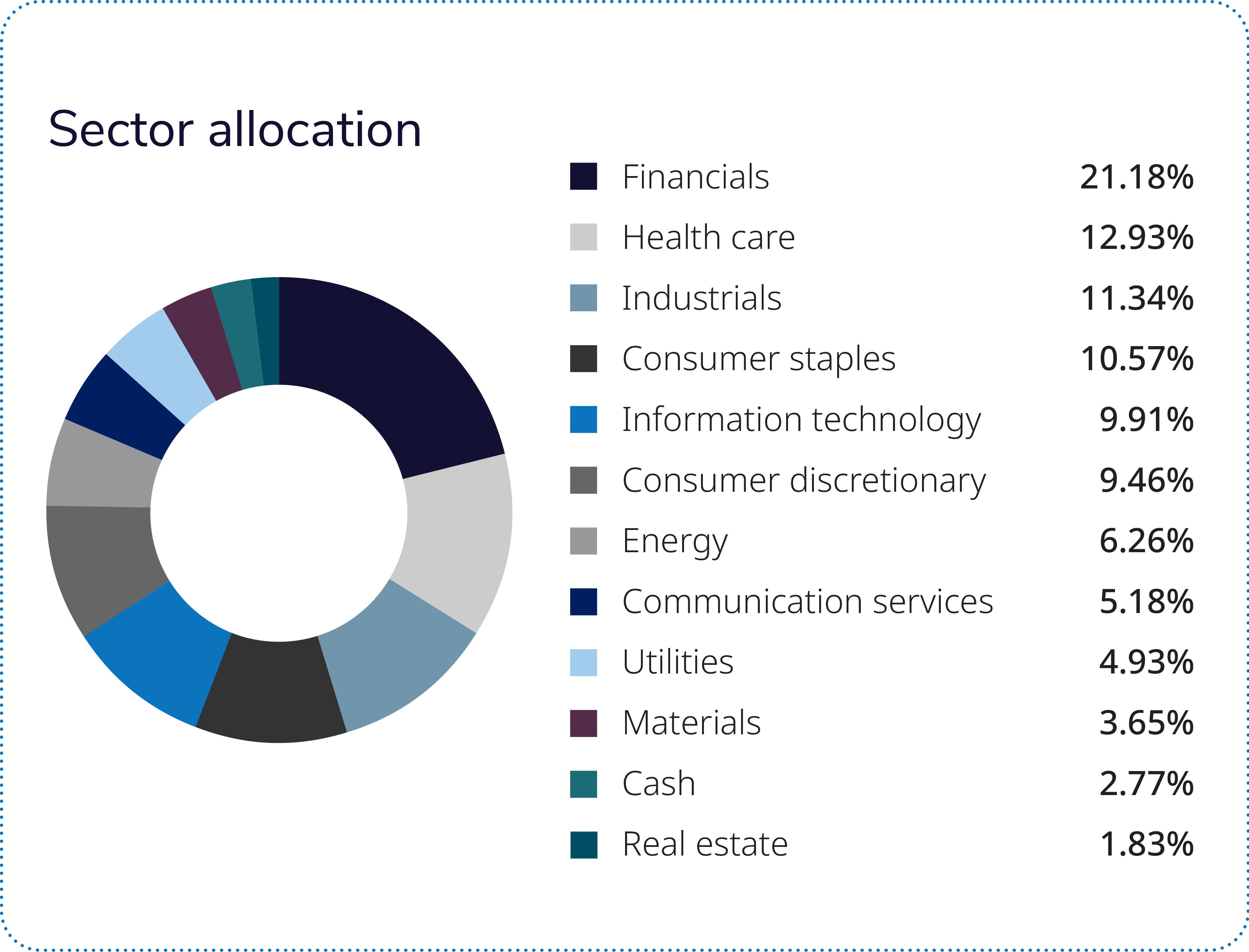 By sector, we remain within +/-5% of benchmark weight. Currently, the largest overweight sectors are consumer staples and consumer discretionary. While financials is the largest weight in the portfolio, it is currently underweight. Communication services, real estate and industrials also remain below benchmark weight.