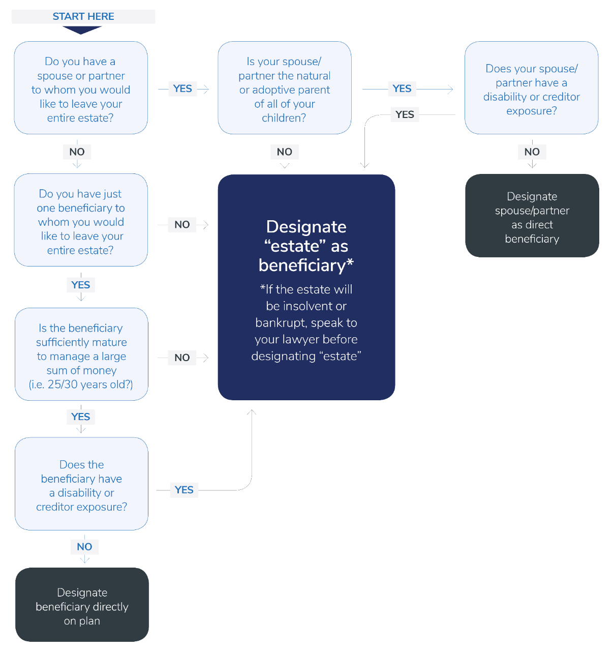 However, designating a direct beneficiary is not recommended for many plan/policy owners, where they have non-traditional or unique family situations, as it can lead to unfavourable tax implications for beneficiaries. We’ve created a beneficiary designations decision tree to help you understand the factors you should consider in designating a plan/policy beneficiary.