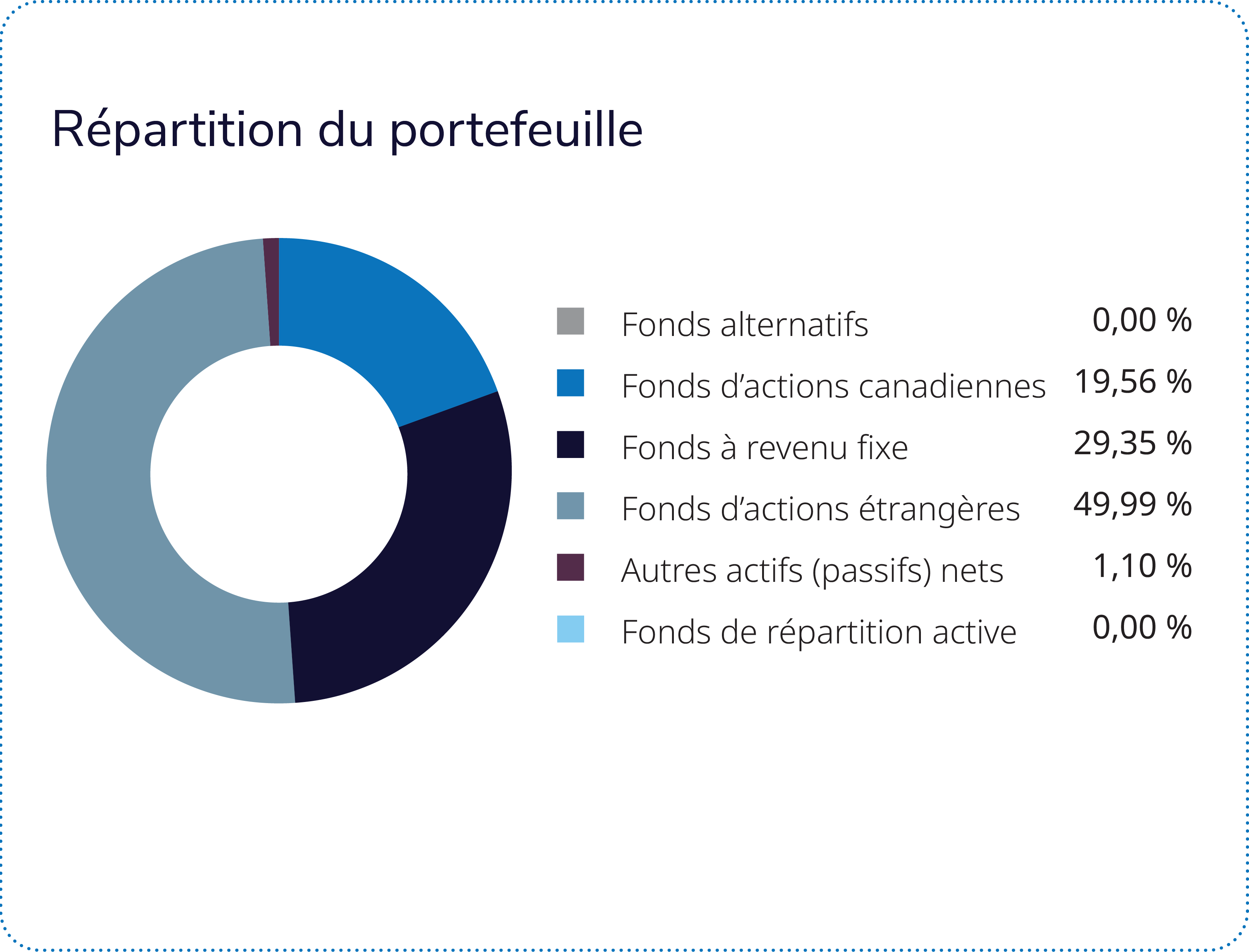 Dans le contexte économique et boursier actuel, le mandat d’actions mondiales du Fonds, qui représente 69 % du portefeuille, a généré un solide rendement positif. Les gains sont attribuables aux secteurs de la technologie de l’information et des matériaux. Par rapport à l’indice de référence, la sélection des titres dans le secteur de la santé a ajouté de la valeur, tandis que celle dans les secteurs de la finance et de la technologie de l’information a nui au rendement.