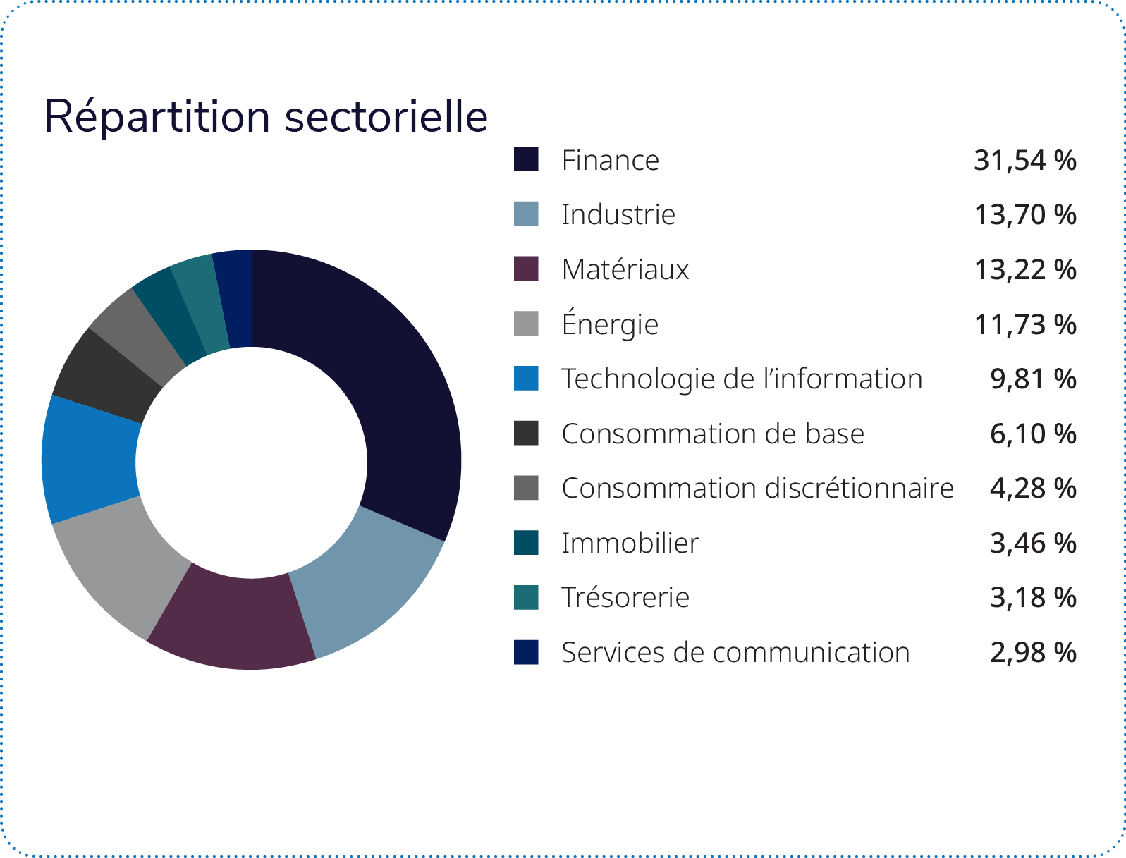 Ces bons résultats ont été neutralisés par l’effet négatif de la sous-pondération du secteur des matériaux et de la surpondération du secteur de l’immobilier. Les facteurs individuels qui ont le plus plombé le rendement ont été la surpondération d’un opérateur boursier et d’une société ayant conclu des ententes d’achat de production d’or.