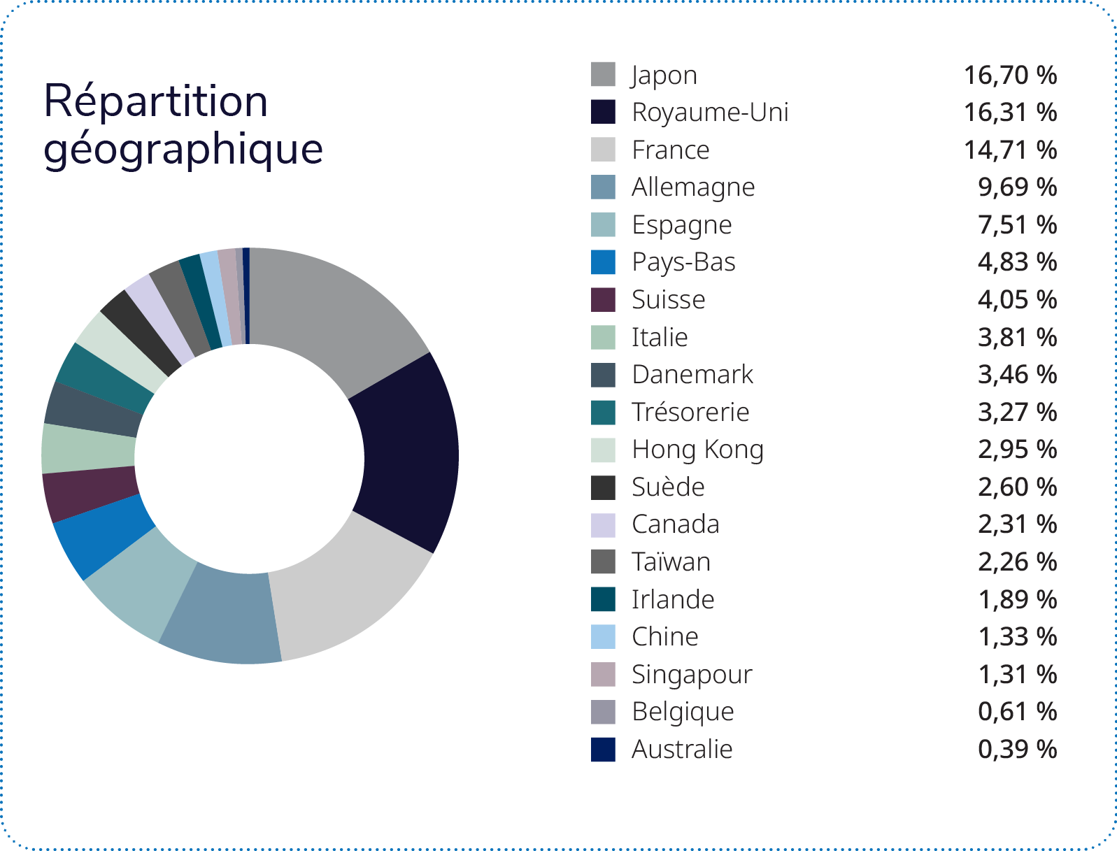 Le secteur de l’industrie demeure le plus fortement pondéré, car il bénéficie de thèmes comme l’augmentation du trafic aérien, l’accroissement des dépenses en défense, la relocalisation et la consommation énergétique de l’IA.