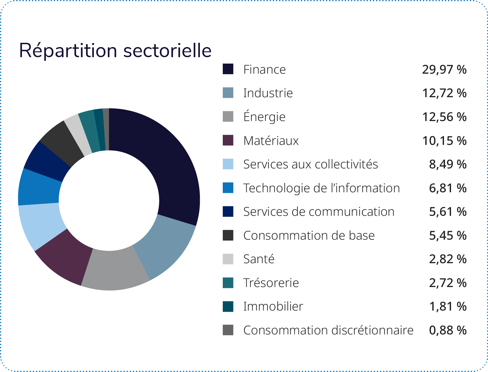 À l’inverse, la surpondération du secteur de la santé, la sélection des titres dans le secteur de l’industrie et l’absence d’actions privilégiées ont contribué au rendement relatif.