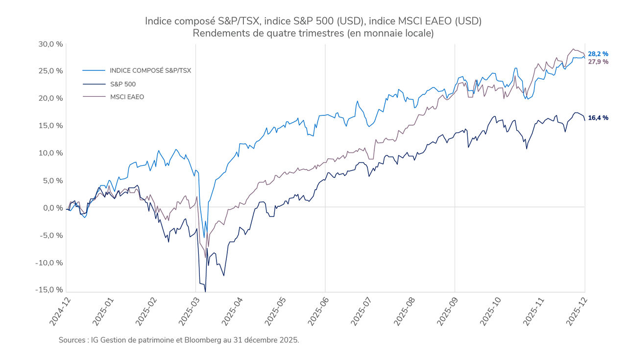Les marchés ont terminé le quatrième trimestre de 2025 en force, clôturant une année marquée par la résilience et des gains généralisés. Les actions ont mené le bal, les investisseurs faisant fi du brouhaha causé par la politique pour se concentrer sur l’amélioration des fondamentaux. Les marchés mondiaux ont progressé, soutenus par les bénéfices des sociétés qui sont demeurés stables, la diminution des pressions inflationnistes et la reprise des baisses des taux d’intérêt. Le Canada a fait mieux que la plupart des autres pays développés, profitant de la vigueur des secteurs des matériaux et de la finance, tandis que les marchés européens et asiatiques ont rebondi à la faveur de la reprise de l’activité commerciale et du regain de confiance des investisseurs. Aux États-Unis, les actions ont continué d’enregistrer des gains, en particulier dans les secteurs de la technologie et des services de communication, et un plus grand nombre de secteurs ont inscrit des rendements, ce qui indique que le marché repose sur des bases plus solides.