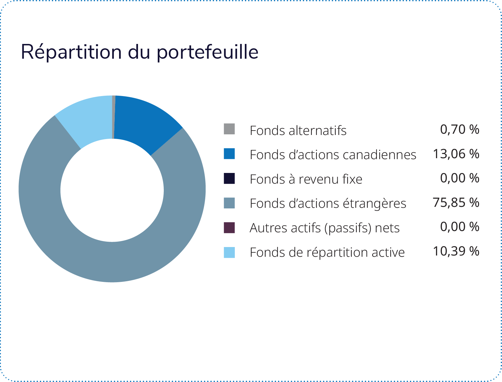 Plusieurs composantes ont toutefois freiné le rendement au cours de la période, à commencer par le Fonds en gestion commune d’actions américaines Mackenzie – IG, dont le léger recul a lourdement pesé sur les résultats en raison de son poids considérable au sein du portefeuille. Le Fonds mondial IG Mackenzie et le Fonds d’actions panasiatiques IG Mackenzie ont aussi fait piètre figure et nui au rendement, tout comme le Fonds en gestion commune d'actions américaines petite capitalisation Aristotle – IG et le Fonds de couverture d'actions mondiales Wellington – IG Mandat privé, mais dans une moindre mesure. Les résultats du Fonds en gestion commune d'actions américaines petite capitalisation Aristotle – IG sont représentatifs des conditions du marché au quatrième trimestre, au cours duquel les petites capitalisations ont tiré de l’arrière sur les grandes capitalisations. Le Fonds de couverture d’actions mondiales Wellington – IG Mandat privé est une stratégie alternative qui vise à procurer de la stabilité lorsqu’il est utilisé comme élément de diversification de portefeuilles plus larges et n’a pas pour but d’enregistrer des rendements supérieurs lorsque les actions mondiales se comportent particulièrement bien.