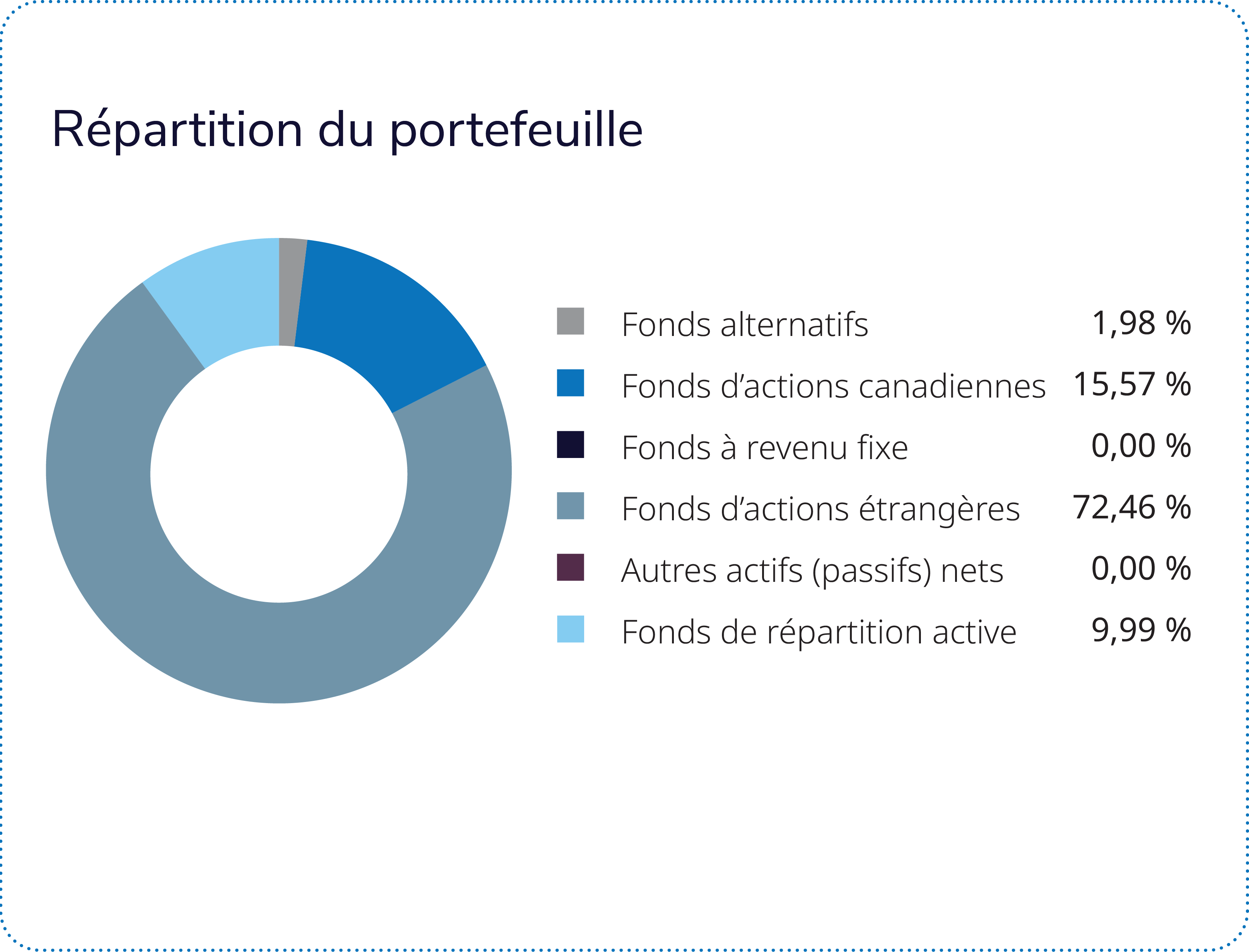 Les marchés boursiers mondiaux ont été majoritairement en hausse au troisième trimestre de 2025. L’indice composé S&P/TSX (12,5 %), l’indice S&P 500 (10,5 %), le Dow Jones Industrial Average (8,0 %) et l’indice composé NASDAQ (13,9 %) ont tous atteint des sommets records (toutes les données correspondent au rendement total, en dollars canadiens). Les marchés internationaux, représentés par l’indice MSCI EAEO (7,1 %) ont progressé, mais plusieurs pays, dont l’Allemagne, ont perdu du terrain en monnaie locale. Les investisseurs ont été rassurés tout d’abord par la conclusion d’accords commerciaux (ou les grandes lignes d’accords commerciaux) qui ont réduit les droits de douane (ou les menaces de sanctions tarifaires) des États-Unis visant de nombreux partenaires commerciaux, ce qui a atténué l’incertitude. Par ailleurs, les données économiques encore étonnamment solides, surtout aux États-Unis, et les pressions inflationnistes contenues ont conduit plusieurs banques centrales à réduire leurs taux d’intérêt directeurs, dont la Réserve fédérale américaine, la Banque du Canada et la Banque d’Angleterre. Par conséquent, toutes les principales composantes en actions du portefeuille ont enregistré des gains substantiels, notamment le Fonds privé d’actions canadiennes Profil (8,7 %), le Fonds privé d’actions américaines Profil (9,3 %), le Fonds privé d’actions internationales Profil (6,2 %), le Fonds privé de marchés émergents Profil (13,4 %) et le Fonds privé de FNB Profil (9,7 %).