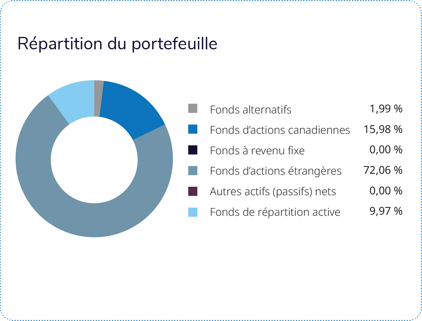 Le Fonds privé à faible volatilité Profil (0,04 %) a été la composante la moins performante du portefeuille. Il a été à la traîne de la plupart des grands indices du marché des grandes capitalisations, en raison de la sous-performance générale des actions à faible volatilité. Les indices d’actions à faible volatilité ont accusé du retard sur les indices comparables à volatilité normale dans toutes les régions. Le Fonds privé de placements alternatifs Profil (0,9 %) a également tiré de l’arrière par rapport aux principaux indices d’actions. Le fonds à faible volatilité et le fonds alternatif sont conçus pour offrir de la stabilité pendant les épisodes de volatilité des marchés et n’ont pas pour but de générer des rendements supérieurs durant les périodes de forte hausse des marchés boursiers.