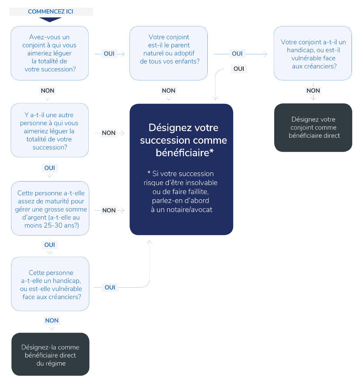 Bien que cet article et cet arbre de décision répondent à plusieurs questions courantes sur la désignation de bénéficiaire pour un régime ou une police, il faut comprendre que chaque famille possède une dynamique et des besoins de planification fiscale qui lui sont propres. Afin d’établir un plan successoral qui reflète réellement vos volontés, il y a d’autres facteurs à considérer. Consultez toujours un(e) notaire ou un(e) avocat(e) en droit successoral, et obtenez des conseils financiers professionnels avant de désigner un(e) bénéficiaire pour vos biens. Pour en savoir plus, demandez à votre conseiller ou conseillère IG un exemplaire de nos livres blancs intitulés Désignations de bénéficiaire - Les choses à faire et à éviter et Guide de planification successorale.